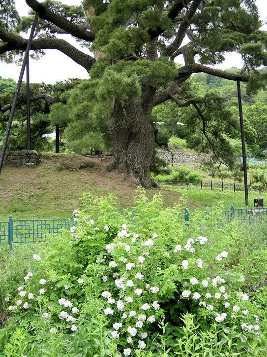 소나무 앞 찔레는 하얀 꽃을 피웠습니다. 무리 지어 핀 찔레꽃은 소나무에 바치는 한 다발 꽃송이 같습니다.