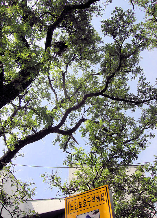 회화나무 밑동에 금줄이 걸쳐 있습니다. 금줄에는 빛바랜 1,000원짜리 지폐 한 장이 꽂혀 있습니다.