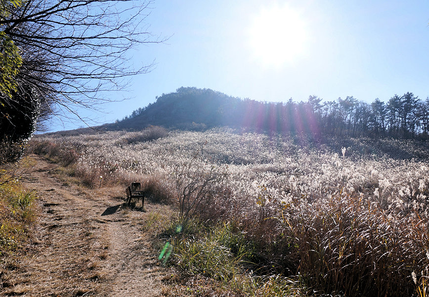 정상으로 올라가는 길옆에 활짝 핀 억새꽃이 햇빛을 받아 은빛으로 반짝입니다.