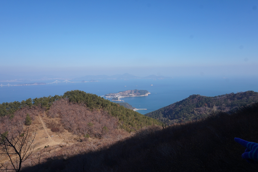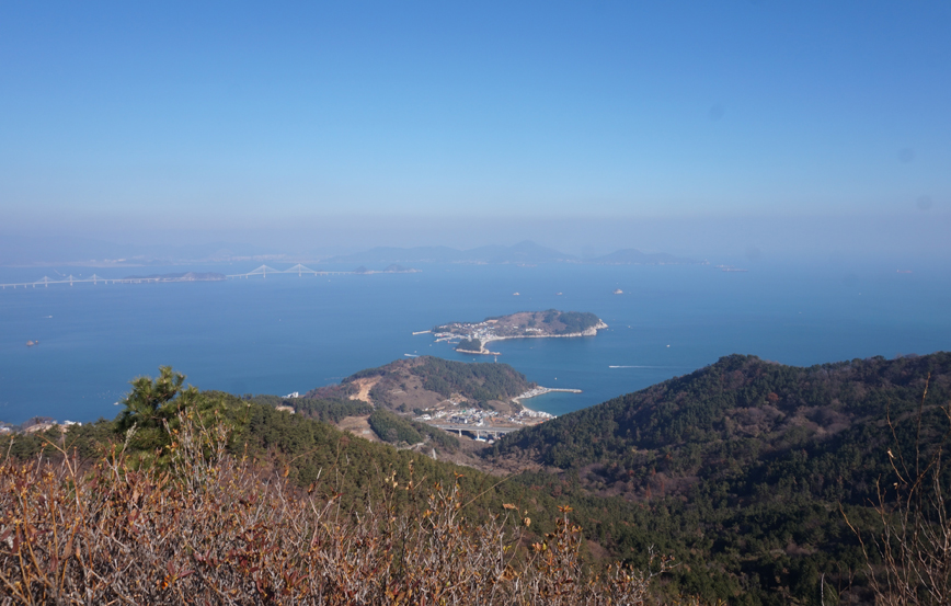 정상에서 바라본 바다입니다. 야트막한 갈바산 너머 겨울 바다에 이수도가 한가로이 떠 있습니다.