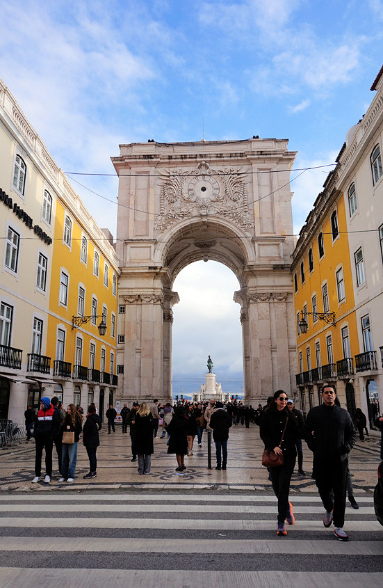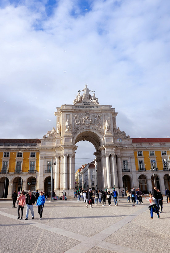 로시오 광장(Rossio Square)에서 남쪽으로 내려가면 코메르시우 광장(Praça do Comércio)이 있습니다. 이 광장으로 들어가는 거대한 출입문인 아우구스타 개선문(Arco da Rua Augusta)이 있습니다.