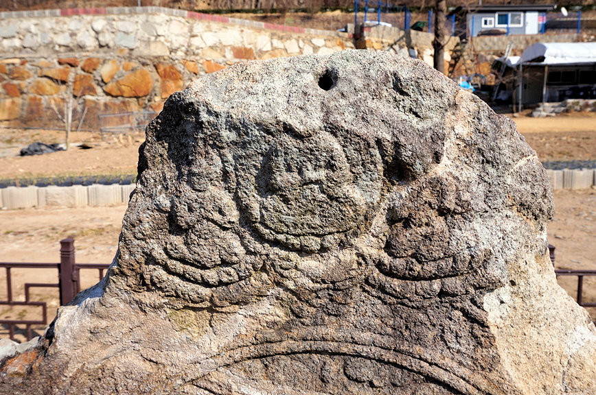 귀부 머리 위쪽에 구멍이 하나 나 있습니다. 뿔이 없으면 용이 아니지요. 뿔을 끼워 넣었던 것으로 보이는 구멍입니다.