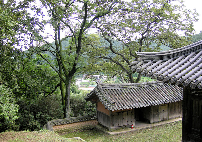 칠우정 앞 두 노거수 너머로 마을이 내려다보입니다.
