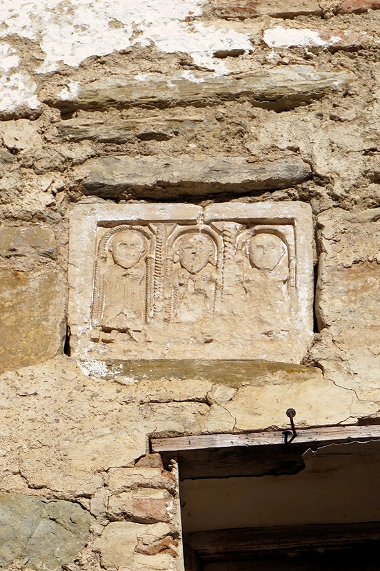 앞면 지붕 아래 벽면에 세 명의 인물이 새겨진 부조가 있습니다. 이 인물들이 누구인지 궁금해집니다.