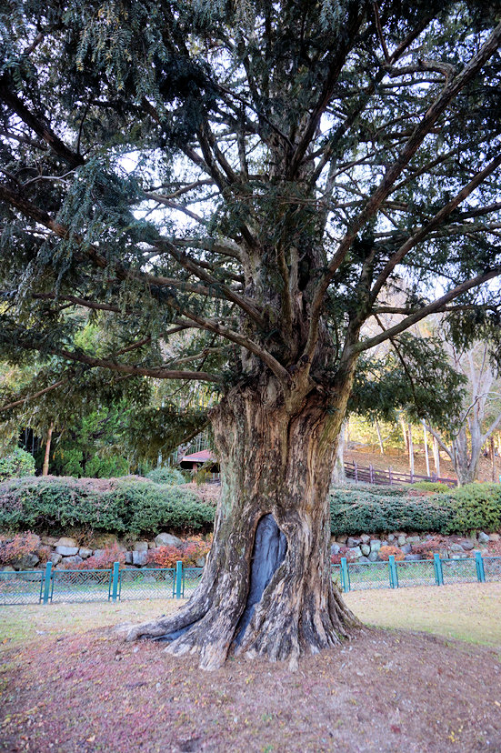 비자나무 가지가 사방으로 뻗어 있습니다. 이 나무는 암나무로 알려졌는데, 최근 일부 가지에 수꽃이 달린다고 합니다.
