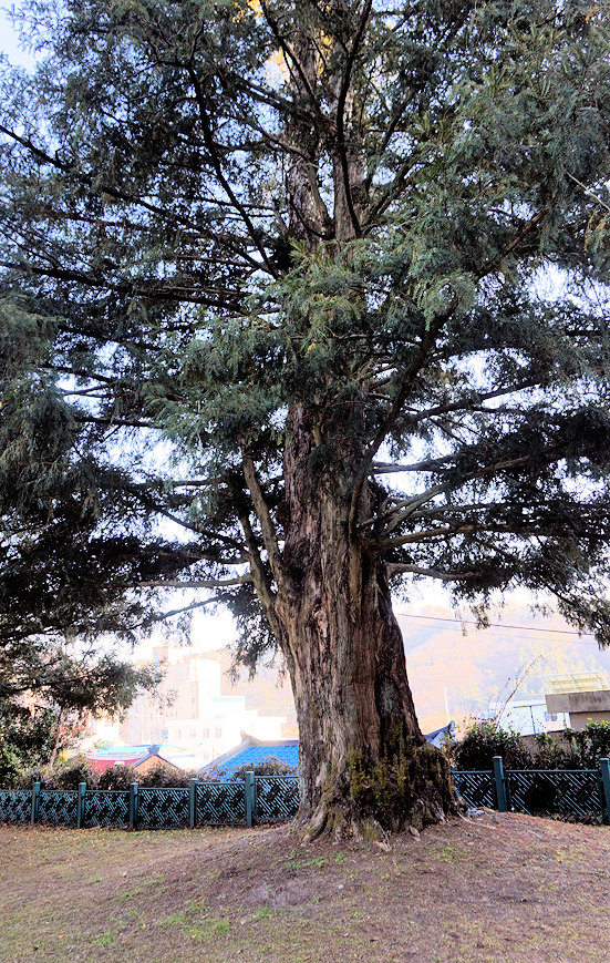 이곳 곤양면사무소 앞에 두 그루 비자나무가 있습니다. 성내리 비자나무입니다. 비자나무는 암수 나무입니다. 키가 큰 암나무에서 약 10m쯤 떨어진 곳에 작은 수나무가 있습니다.