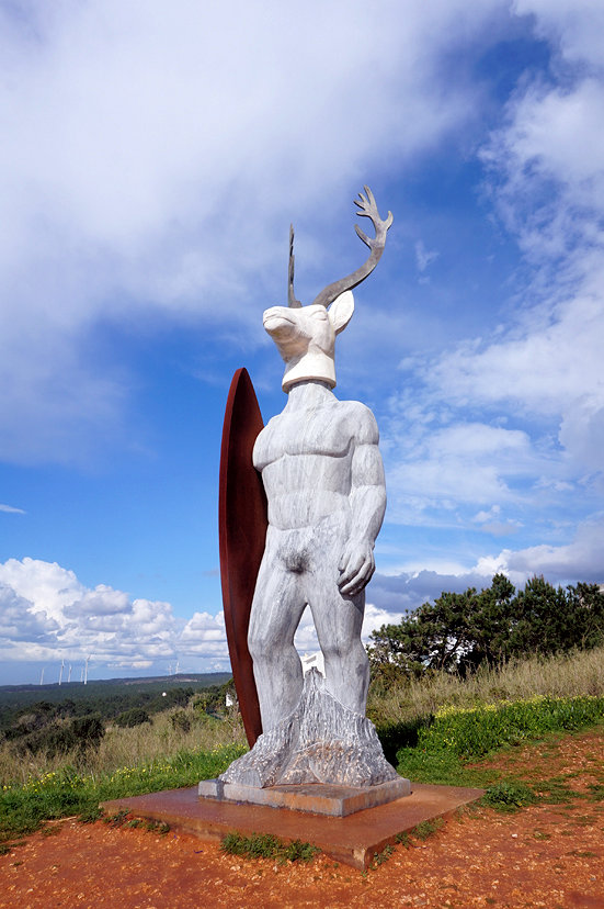 이 조각상은 반은 서퍼, 반은 사슴입니다. 이는 나자레의 두 가지 특징적인 요소, 즉 서핑에 대한 열정과 이곳의 한 템플 기사단원이 사슴을 사냥할 때 나자레 성모로부터 기적적인 도움을 받았다는 전설을 표현한 것입니다.