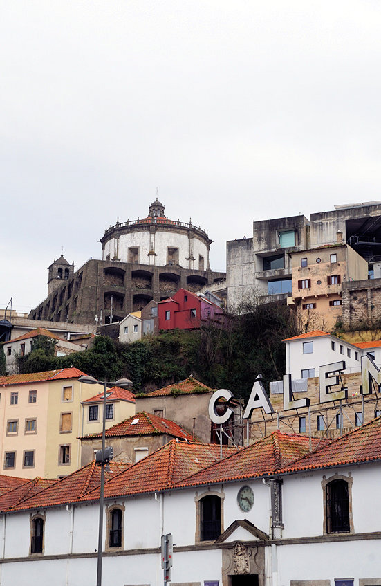 포르투 와인을 파는 카렘(Cálem) 간판 위로 세하 두 필라르 수도원(Mosteiro da Serra do Pilar)이 보입니다.