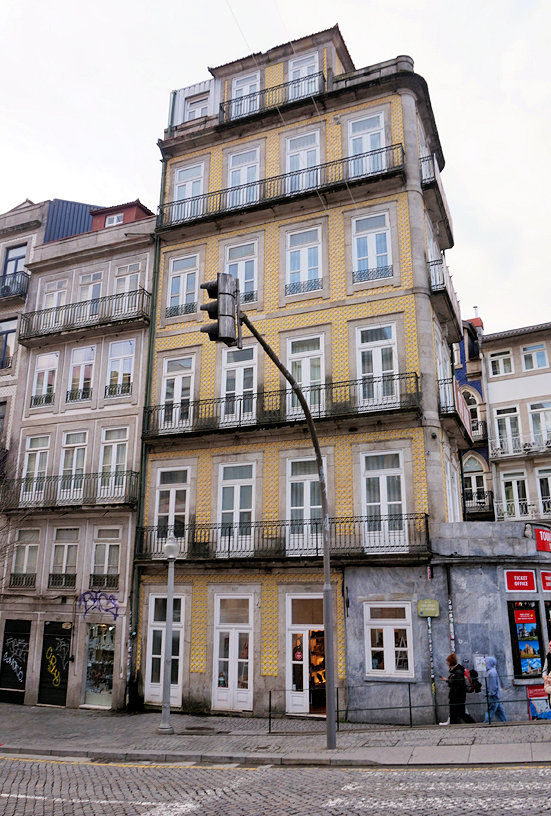 포르투 시내입니다. 도롯가에 노란 타일로 벽을 장식한 건물이 있습니다.
