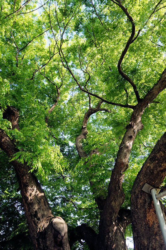 여름으로 향해 달리는 봄날, 위로 뻗은 느티나무 가지는 초록색 나뭇잎으로 무성해지고 있습니다.
